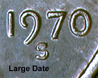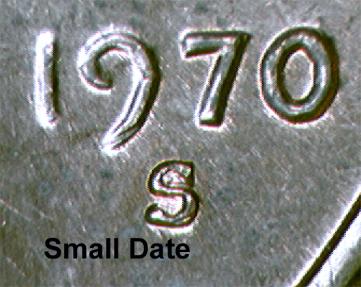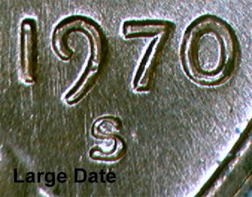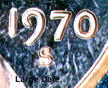 The 1970 S small date proof and 1970 S large date proof can be distinguished in the same ways. Below are some pictures of the 1970 S small and large date proofs: